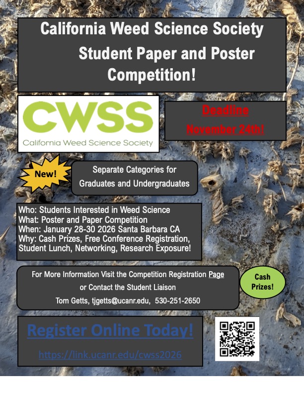 The California Weed Science Society (CWSS) is preparing for the 78th Annual Conference and is will be accepting applications for the Student Paper and Poster Contest soon. At this time the conference is being planned as an in person event held on January 28-30, 2026 At the Hilton Santa Barbara Beachfront Resort in Santa Barbara, CA. It is an EXCELLENT opportunity for students to share their research results by competing in a paper or poster competition for CASH PRIZES.